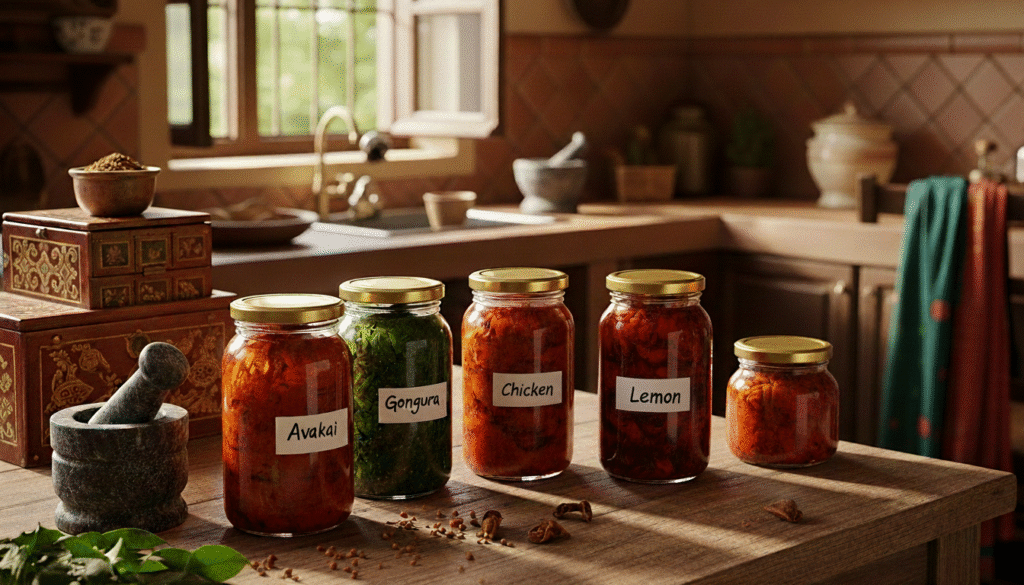 ✓ Pickles (Avakai, Gongura, Lemon, Prawn, Chicken) – 6–12 months shelf life